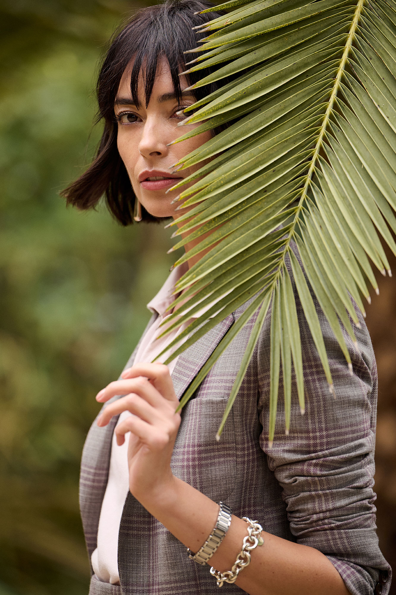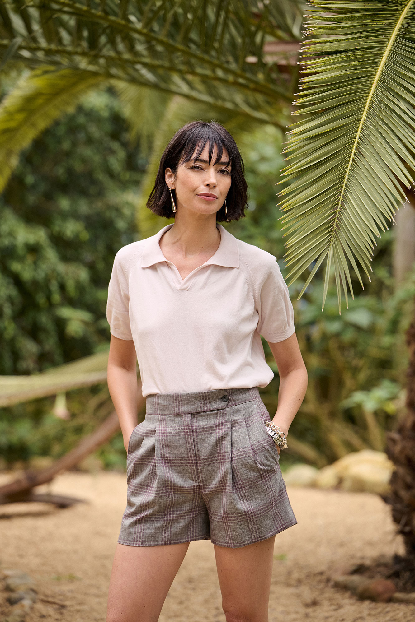 The Ginger shorts in gray plaid offer a tailored, mid-rise fit with clean front pleats and slant pockets. Designed without back pockets for a streamlined silhouette, they provide a polished yet comfortable option for warm-weather dressing.