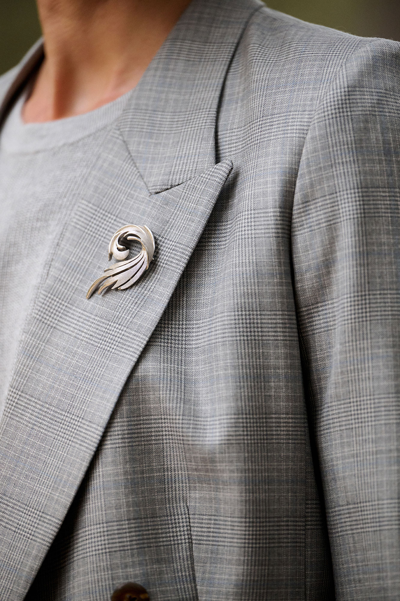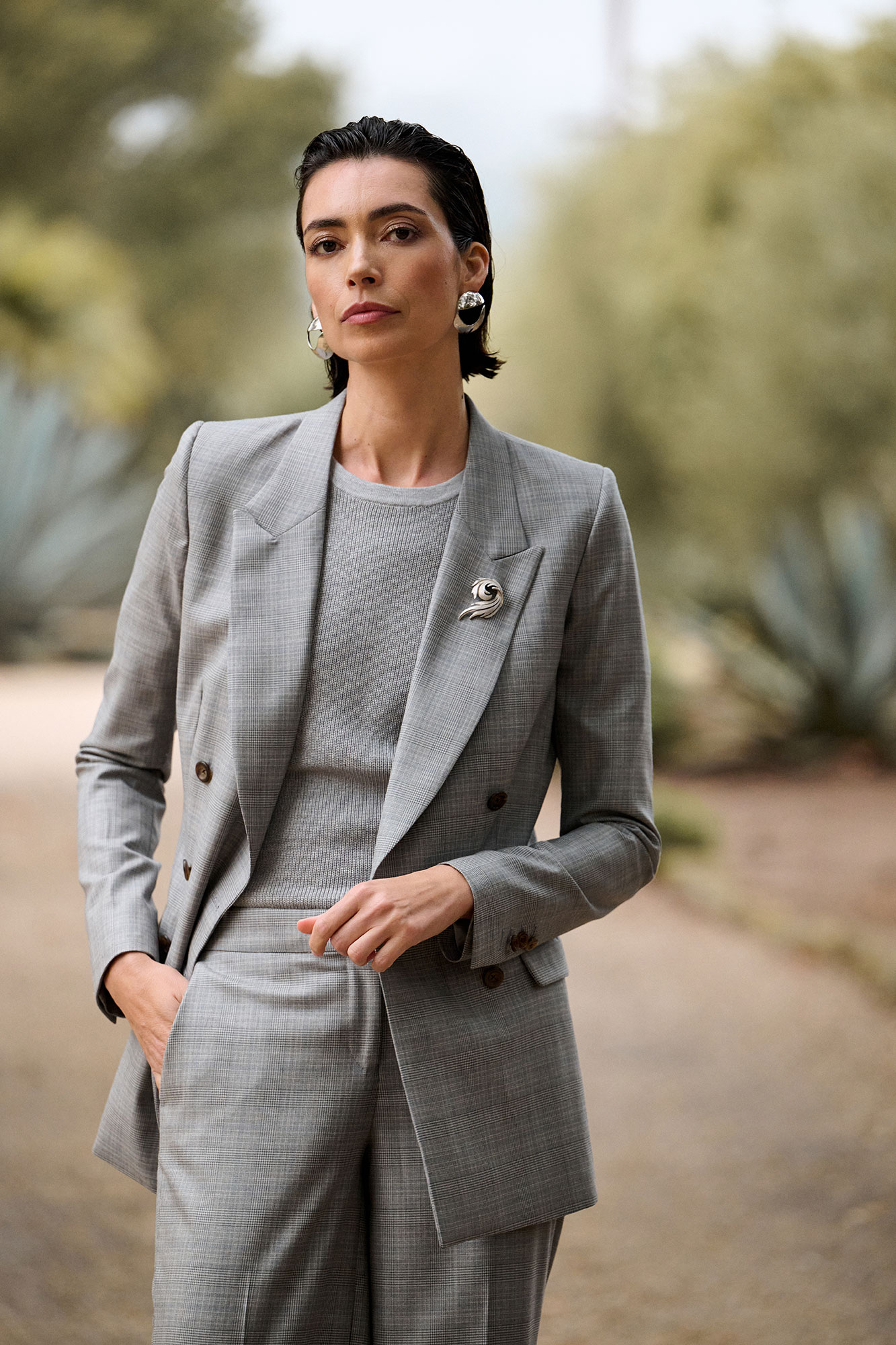 The Charlie jacket in gray plaid delivers classic tailoring with modern refinement. Featuring a structured silhouette, peak lapels, and dark brown buttons, it adds polished sophistication to any wardrobe.