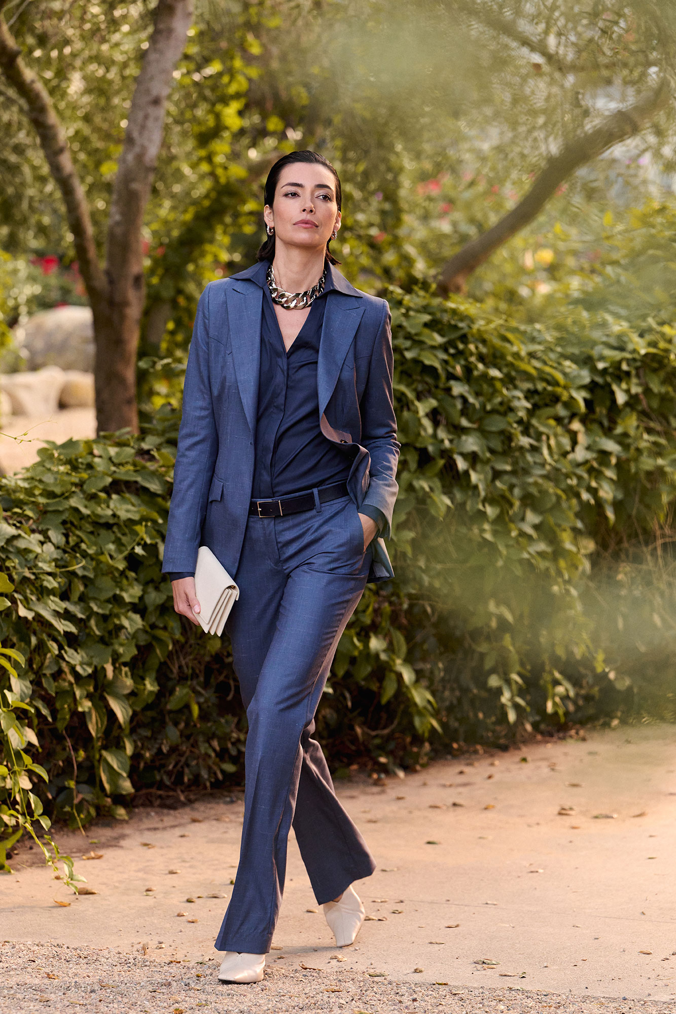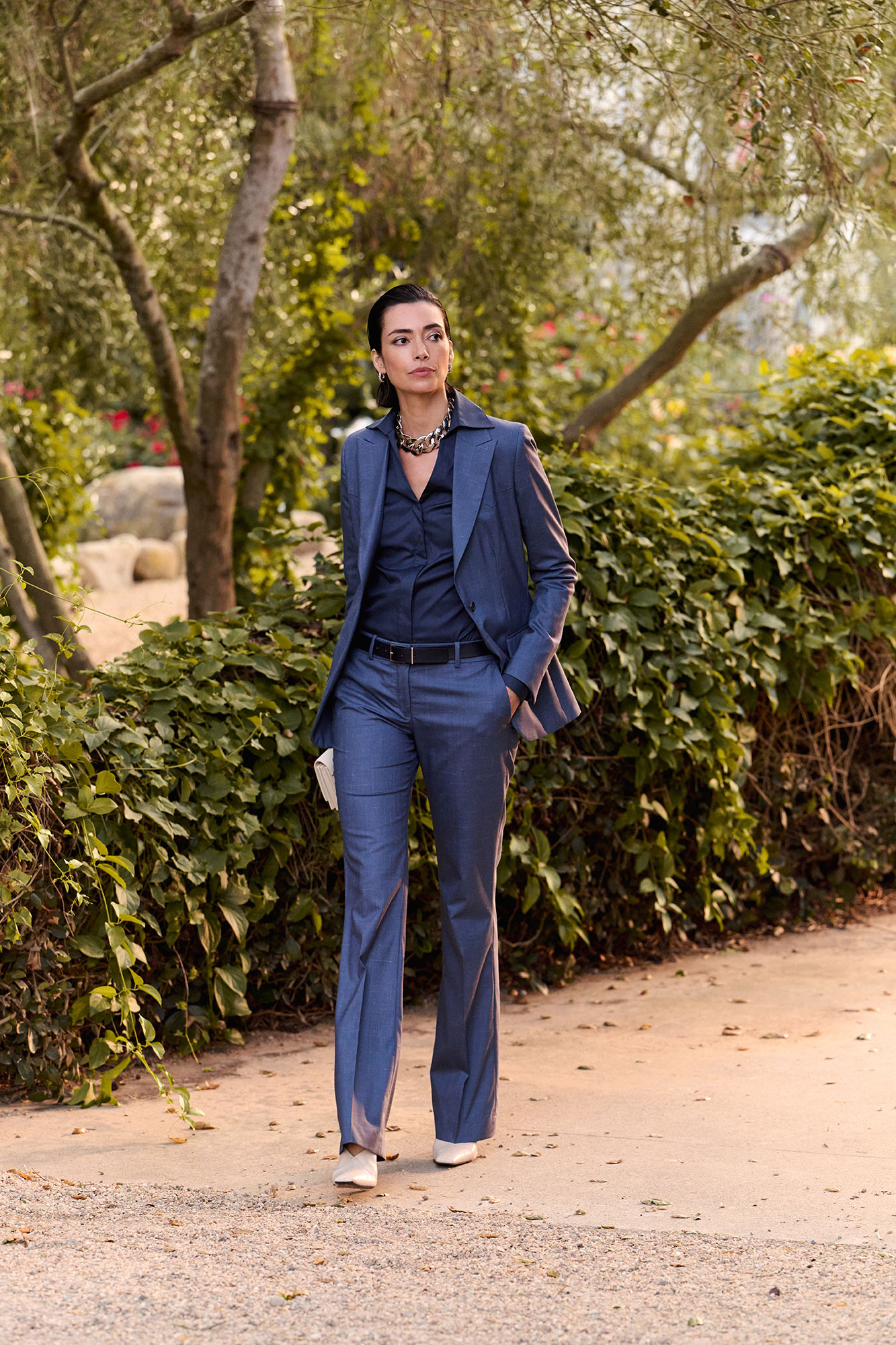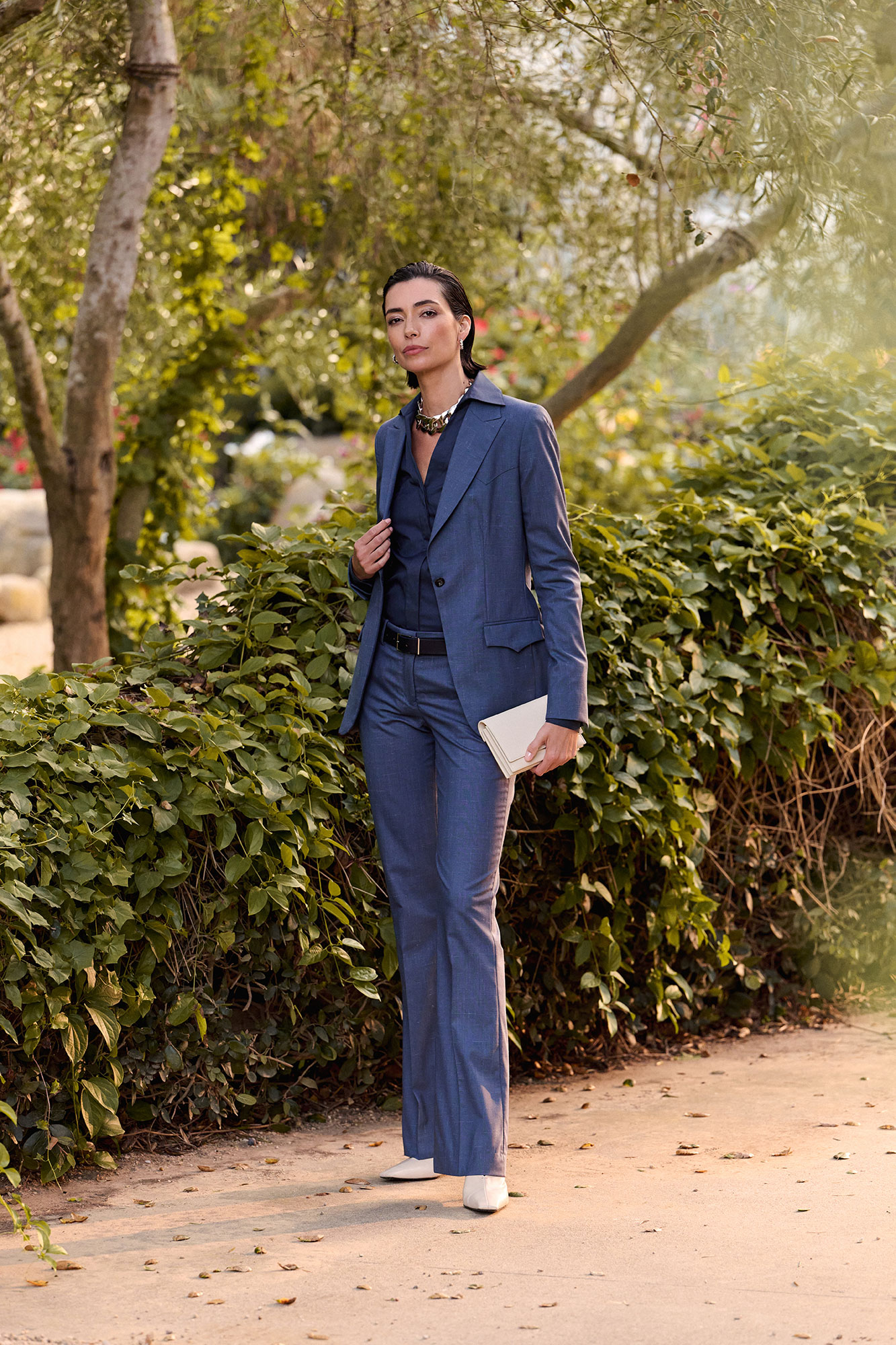 The Navy Maddie shirt combines elegant lines with a tailored fit, featuring a one-button square cuff that pairs beautifully with jackets. Finished with French seams along the inside or side, it offers refined construction and effortless sophistication. Designed for versatile styling, it can be worn tucked or untucked, making it a polished wardrobe essential.