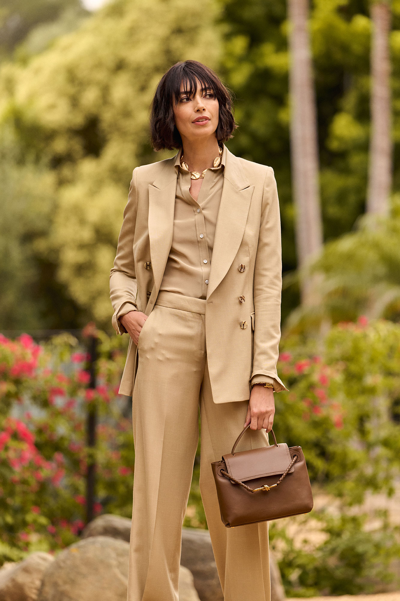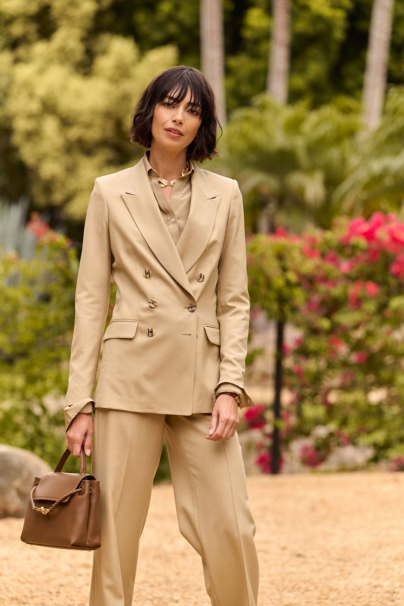 This khaki double-breasted suit offers a refined warm-weather take on classic tailoring, crafted from a lightweight wool, silk, and linen blend with natural texture and breathability. Paired with a tan cotton poplin shirt, the look feels polished yet effortless. Perfect for occasions that call for structure without heaviness.